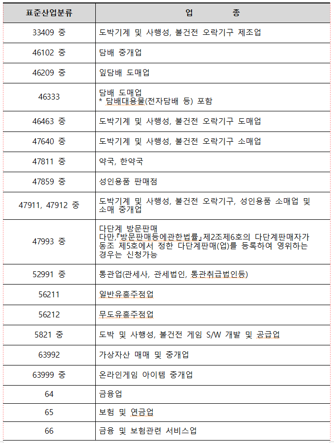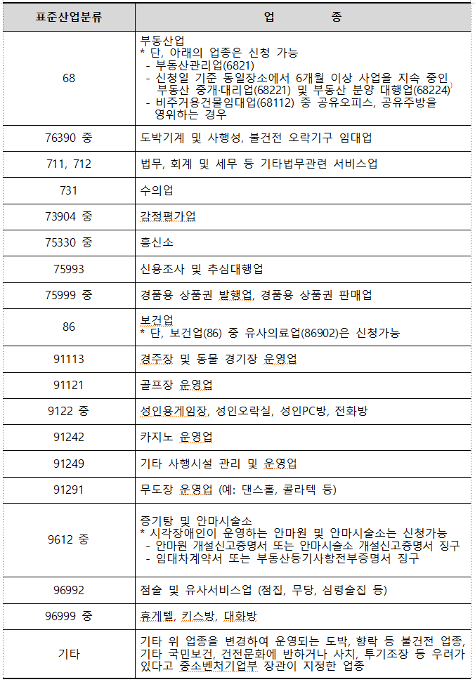 - 소상공인 정책자금 지원 제외 업종(붙임 참고)