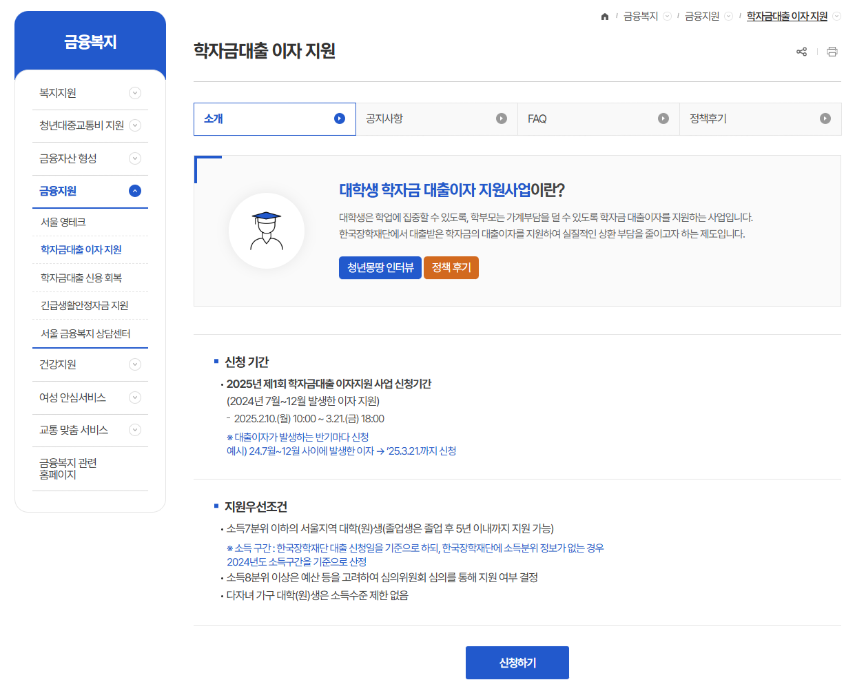 서울시에서 대학생들을 위한 지원 정책이 나왔습니다. 바로 2025년 대학생 및 대학원생의 학자금 대출 이자 지원 사업입니다. 대출 이자 부담을 덜어주기 위해 서울시에서 지원하는 만큼, 아래 내용을 확인 후 꼭 신청하시어 지원 받으셨으면 좋겠습니다.