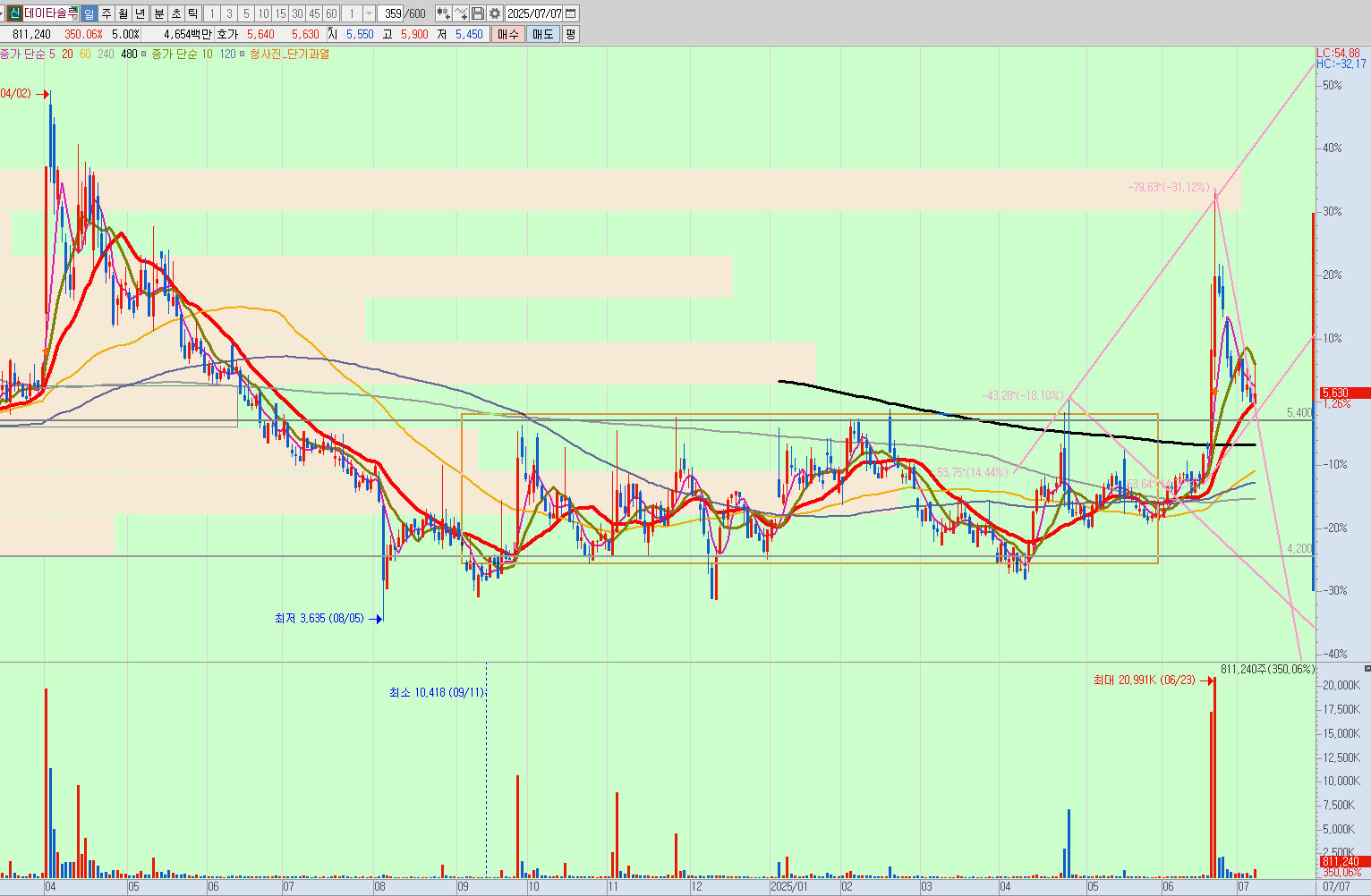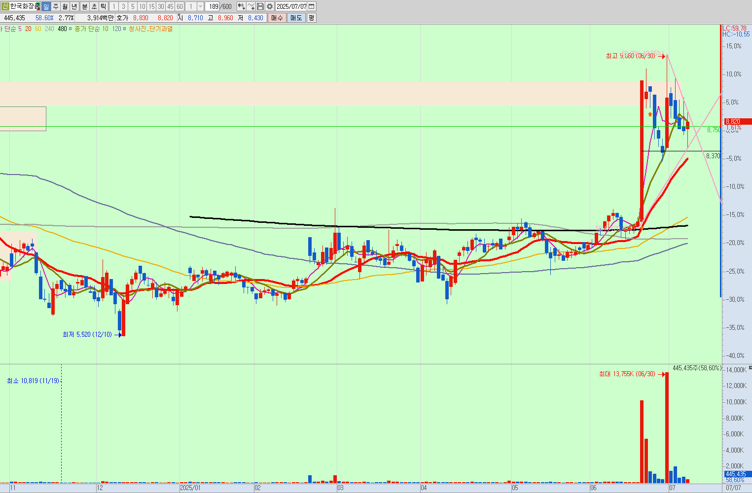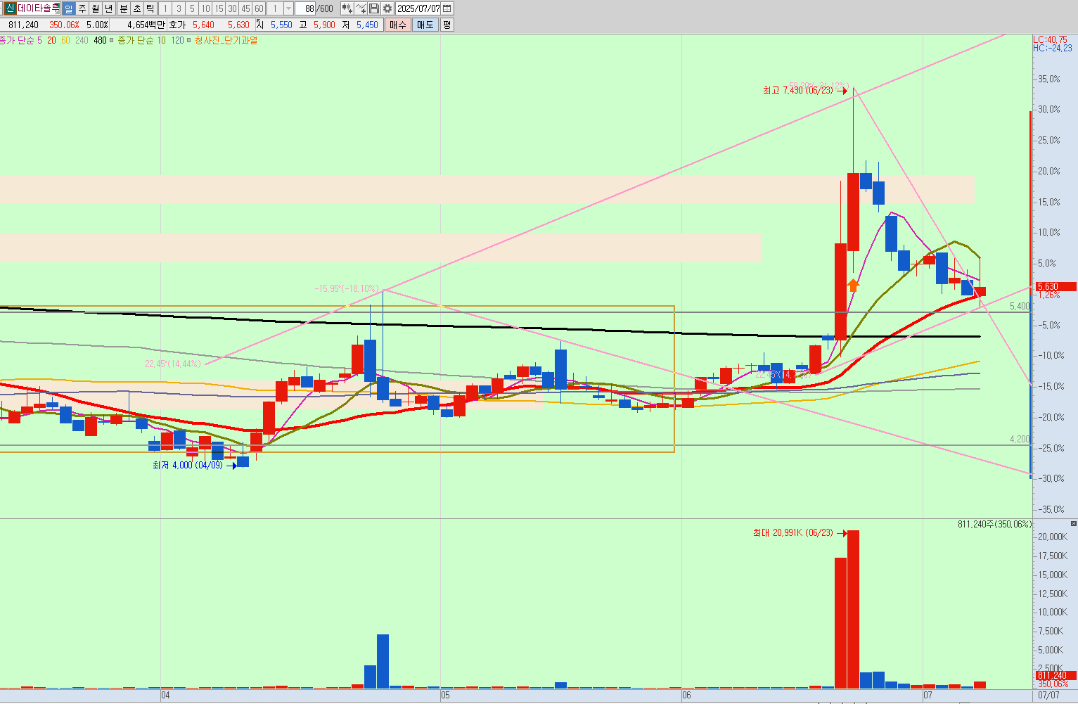 일봉을 보면 480 장기 이평 아래서 바닥을 만들던 주가는 6월 20일 위 뉴스로 상한가를 기록하였다.