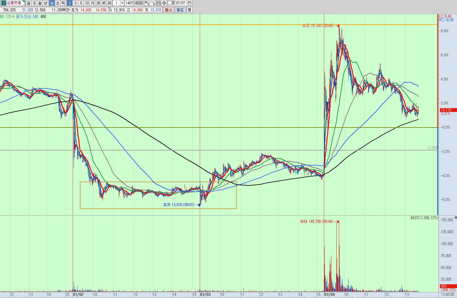 이 종목은 상한가 이후 이렇다한 반등 없이 바로 조정에 들어갔고 최근에는 상한가_기준봉의 시가까지 조정을 받게 되었다. 하지만 7월 2일, 3일을 보면 기준봉의 시가를 누군가가 훼손하지 않고 잘 지켜준 모습을 분봉에서 확인할 수 있었다.