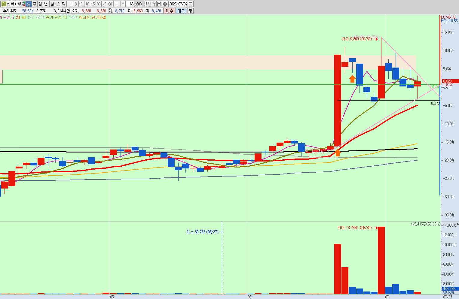 일봉을 확대해서 보면 6월 20일에 저항으로 작용하고 있던 480이평을 강하게 돌파해주면서 이틀연속 20%가 넘는 상승을 보여주었다. 그리고 오늘까지 10일간 조정을 보여줬다. 오늘 나온 도지형 캔들이 의미있는 캔들이라고 보이는데, 이유는, 20이평을 지켜주었고, 윗꼬리가 달리면서 10이평까지 매물대 체크한 모습도 보여줬고, 거래량도 최근 거래량보다 3배정도 더 나온 모습을 보여줬기 때문이다. 또한 하락추세를 벗어나는 캔들이 만들어졌기 때문이다.