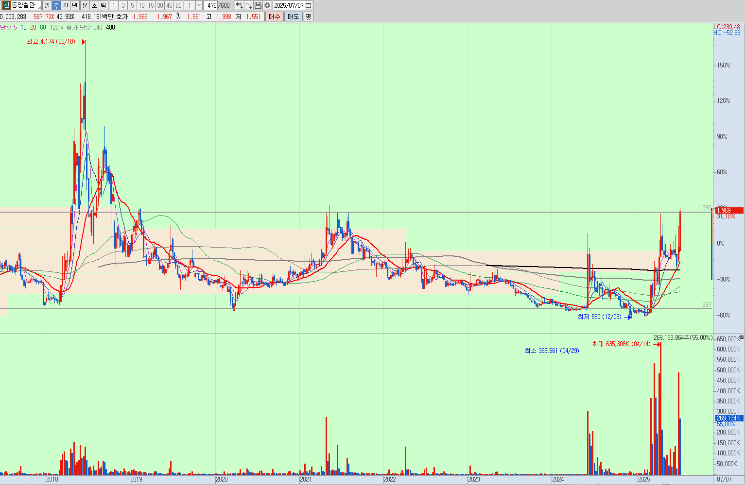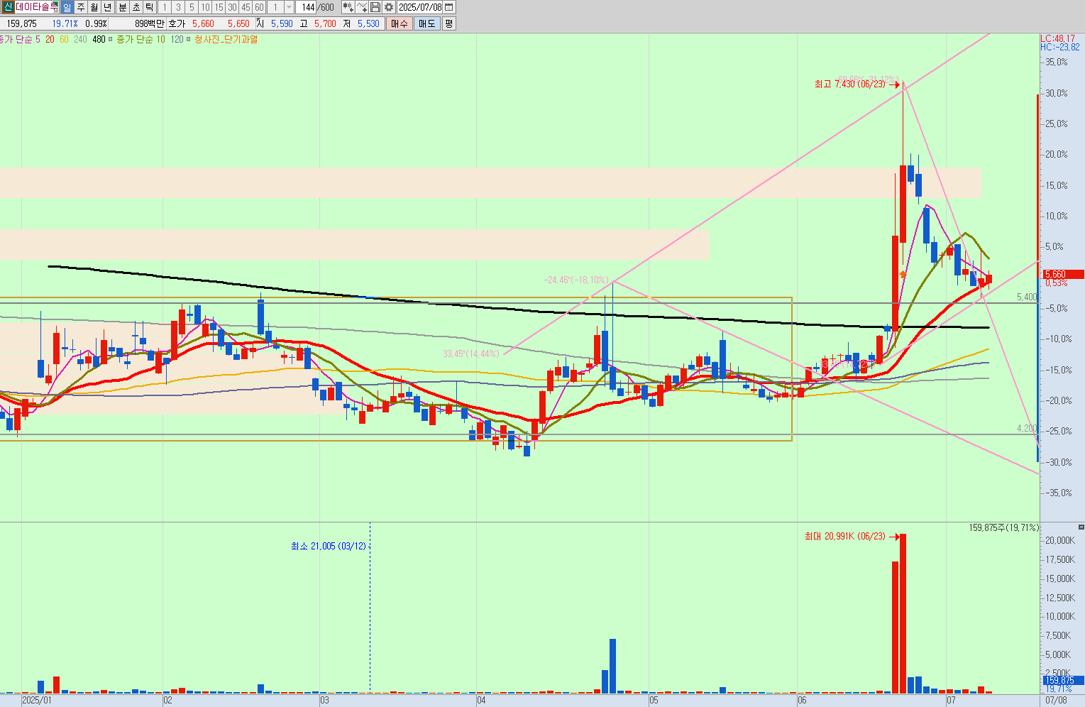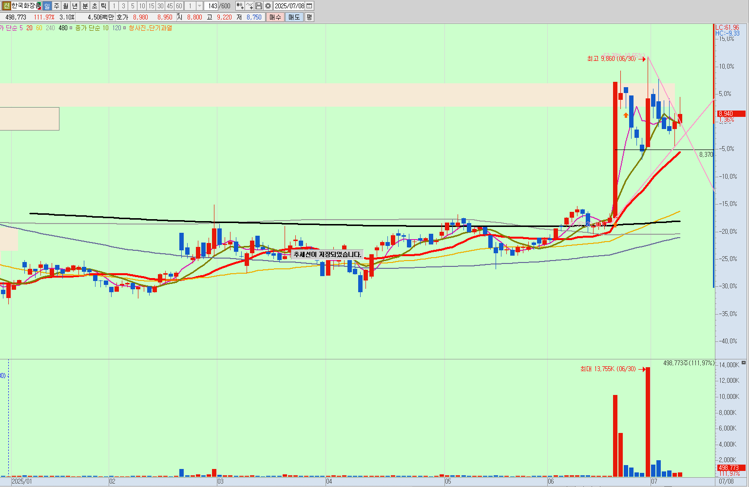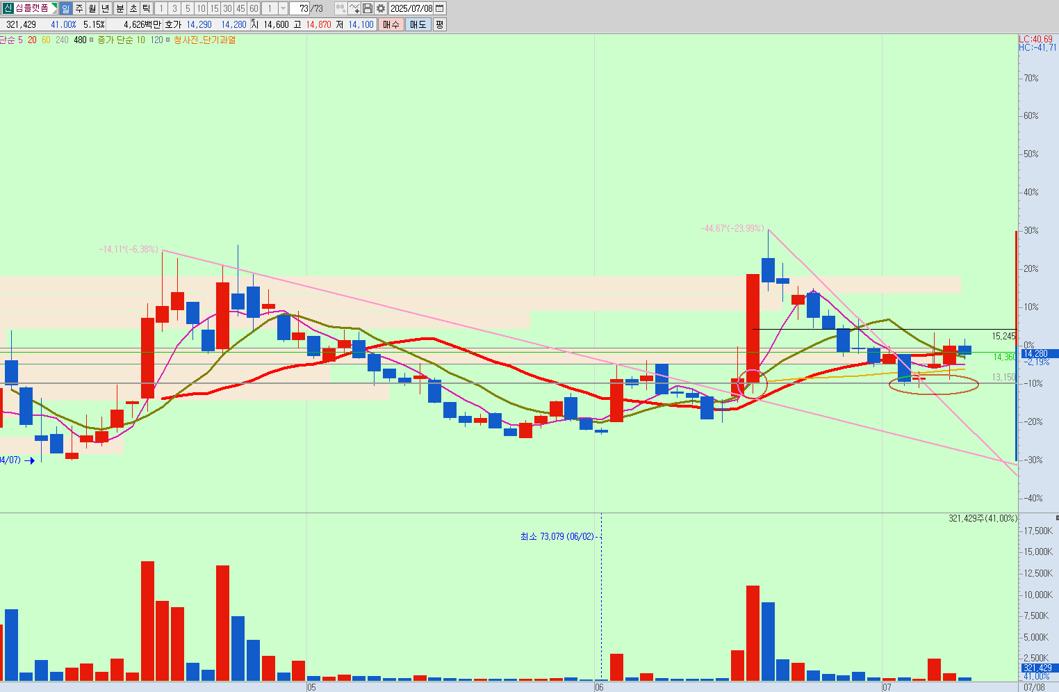 월봉을 보면 상한가 근처가 저항 부분으로 보이는데, 상한가에 안착을하고 저항을 뚫어줄것인지, 저항 맞고 떨어질것인지 지켜봐야될 것으로 보인다.