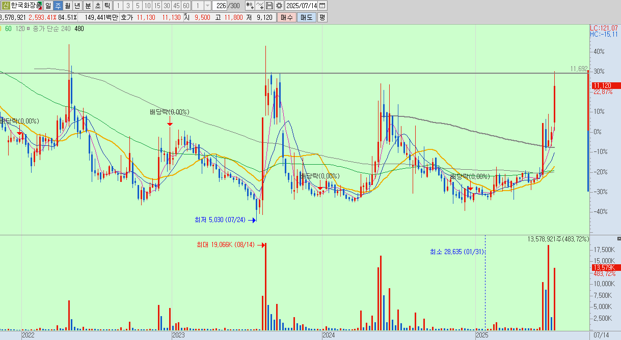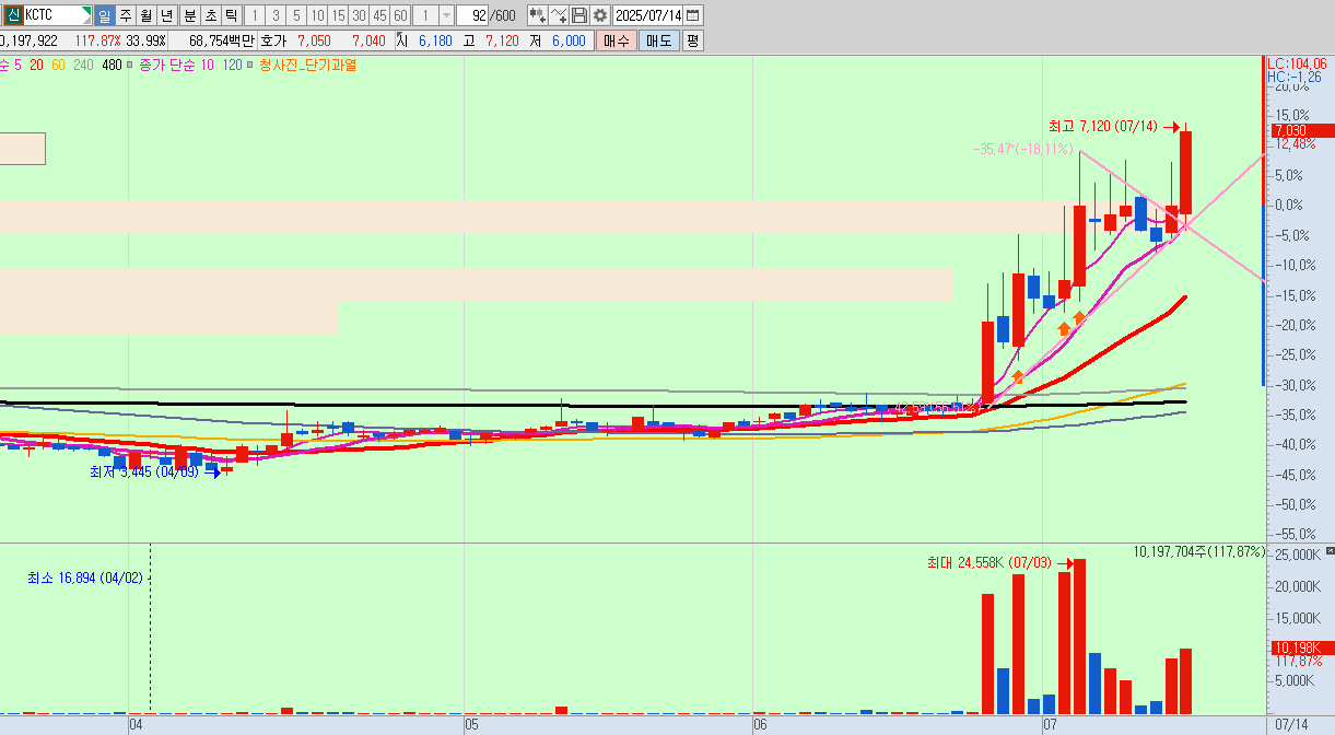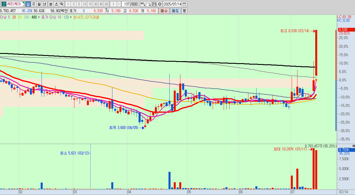 최근 관심종목이었고, 8시 정규장 시작전부터 큰 상승을 보여줬다. 아직도 자리는 20% 이상에서 유지중이며 상한가 안착을 하는 지, 아니면 조정에 들어가는지 확인해봐야 될것으로 보인다.