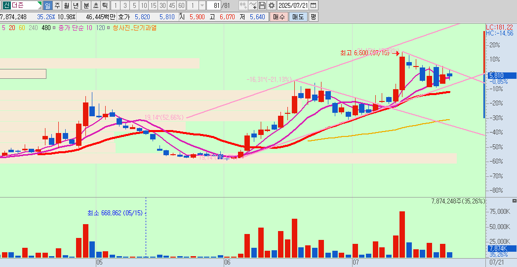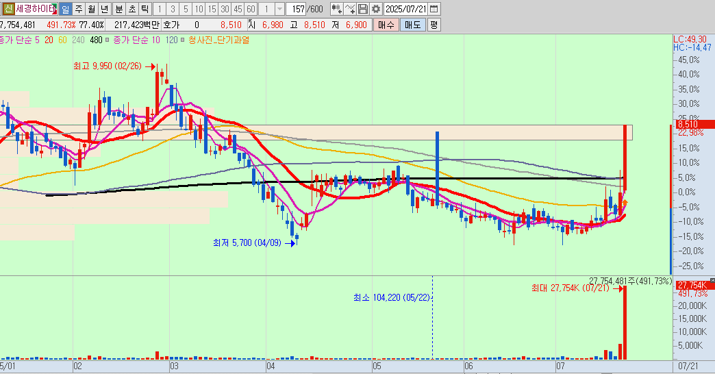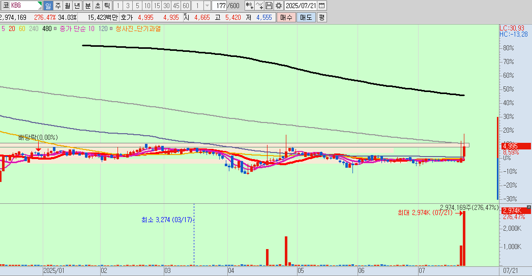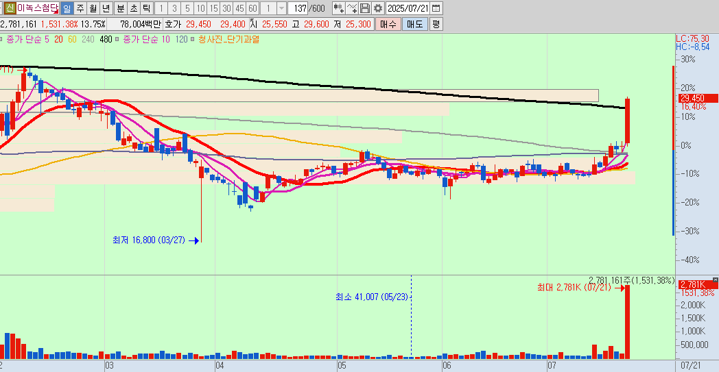 미국과 관세협상에서 '모든것들은 일단 테이블위에 있다'라는 언급으로 이 종목이 반등이 나왔다. 알레스카 LNG, 소고기 관련은 관세 협상이 끝나기 전까지 이슈가 살이있다고 판단할 수 있는 근거는 동양철관도 그렇고 이 종목도 그렇고 아직 차트가 살아 있기 때문이다. 즉, 언제든 상승이 나올 수 있다는 얘기다.
