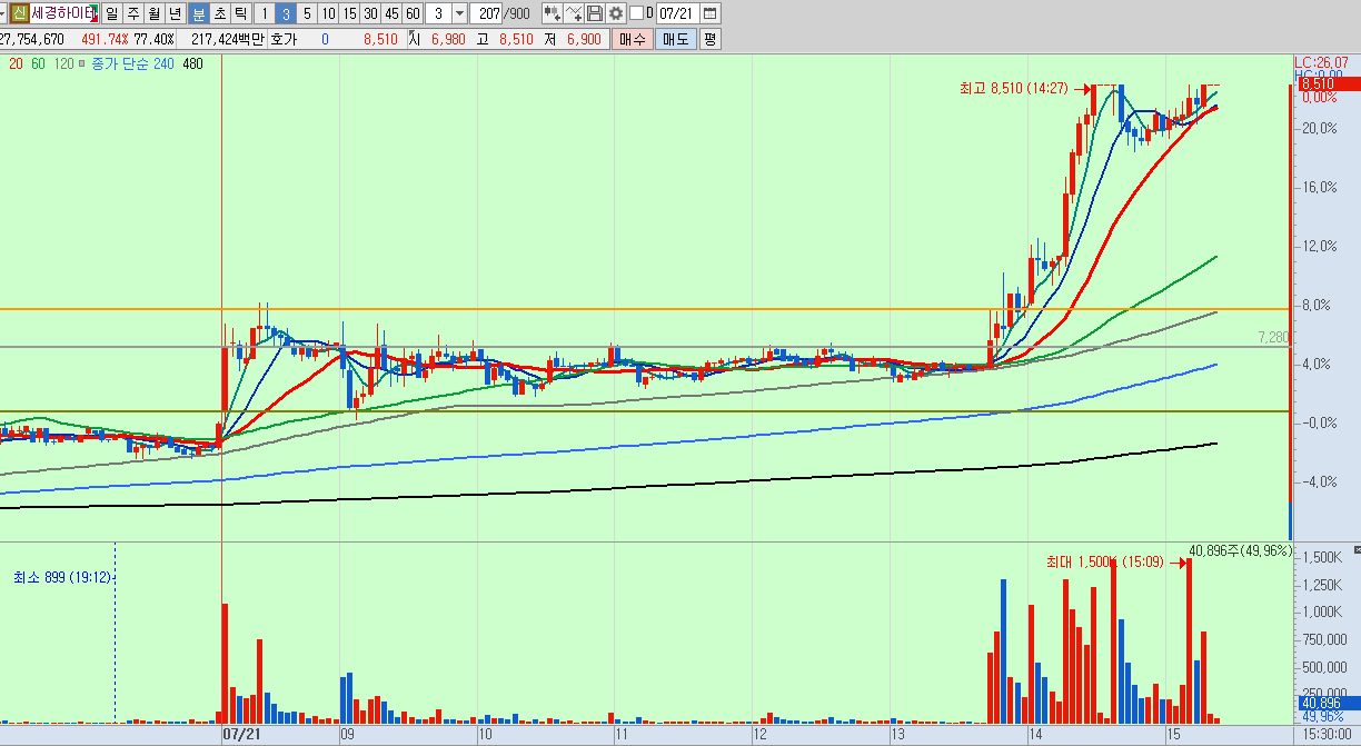 3분봉을 보면 7280원이 480 저항자리었는데, 근처에서 오전내내 횡보한 모습을 볼 수 있다. 그리고 2시가 가까워질쯤 거래량이 다시 늘면서 반등해주더니 상한가에 안착한 모습이다. 추가적으로 더 상승을 할지 조정을 할지는 지켜봐야 될 것 같다.
