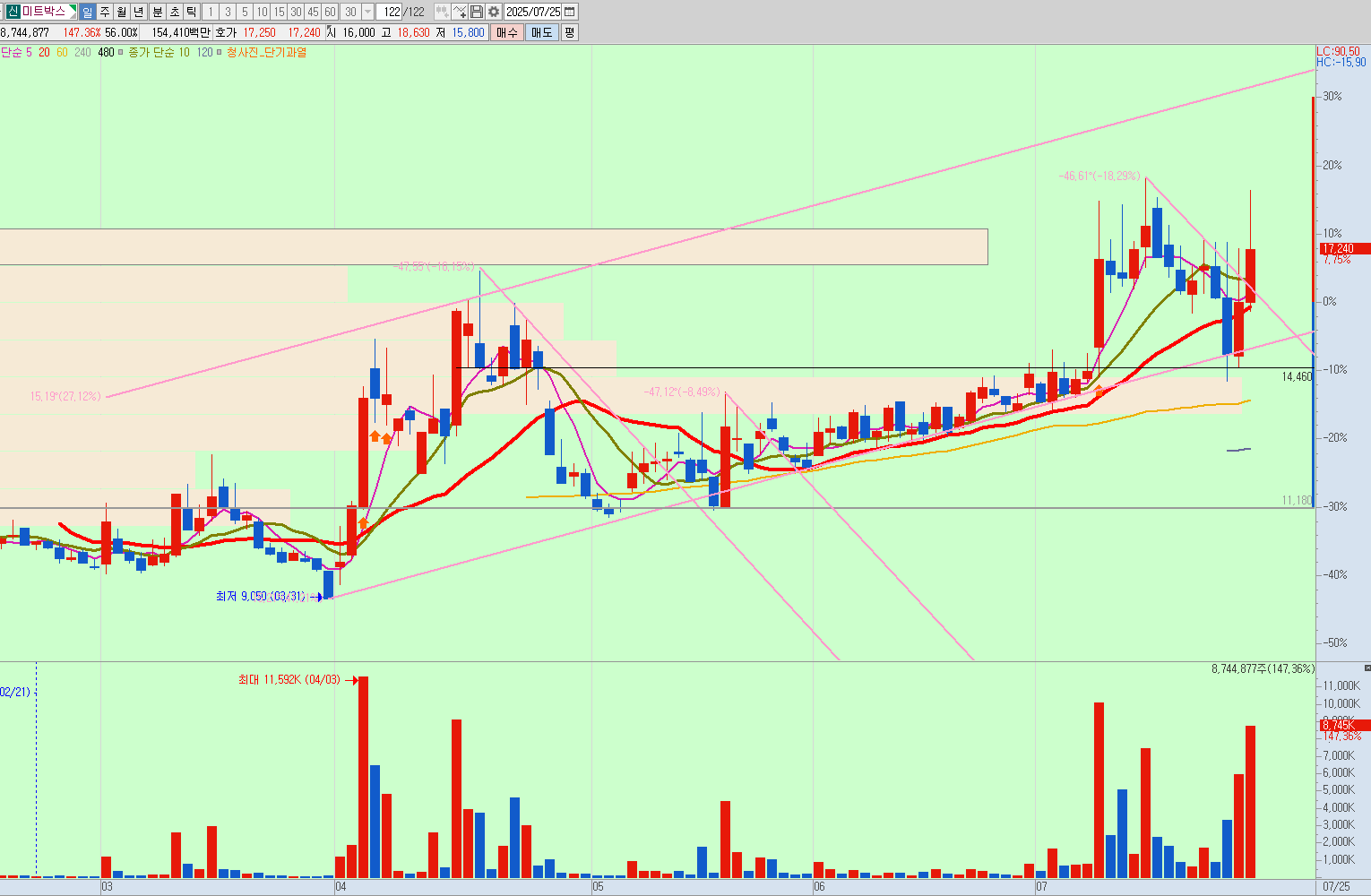 이 종목은 갈거면서 왜 힘들게 했을까... 21일에 매수했다가 다음날 수익을 봤지만, 목표가까지 도달하지 않았다가 손절했던 종목이다. 어쨌든 어제, 오늘 반등이 나오면서 강한 모습을 보여줬다. 이 종목도 한미관세협상 관련주로 충분히 이슈가 살아있는 종목이라 관심종목으로 뽑아봤다.