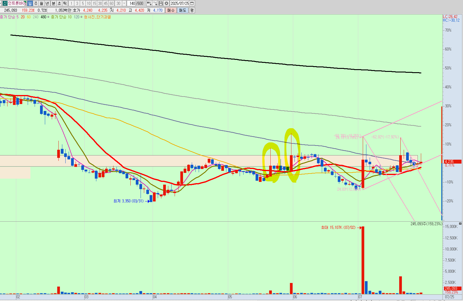 하락하던 주가는 최저가를 기록 후 조금씩 반등을 하더니 매집봉들이 나와줬고, 7월 2일 상한가까지 가는 장대 양봉이 나왔다. 그리고 최근에 17일에 크기는 작지만 비슷한 양봉이 나왔다. 매집은 충분히 되어있다고 판단되고, 조정도 어느정도 했고, 어제 오늘 단기이평들 지지해주면서 도지 캔들을 만들었기 때문에 조만간 반등이 나오지 않을까 싶다. 당장 내일갈지 모레갈지 일주일뒤에 갈지는 모르지만, 세력 맘이니까. 하지만 반등 나올 가능성은 있어보인다.