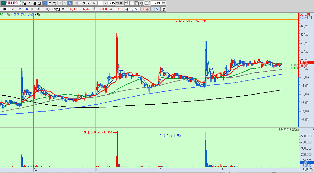 일봉을 보면 위쪽 저항을 계속 맞고 떨어지는 모습을 볼 수 있다. 여러번 도전했지만 실패. 그리고 최근에 또 도전을 하고 있는 모습니다. 이 종목을 관심종목으로 뽑은 이유는 최근 4일간의 캔들을 보면 전부 도지형 캔들인것을 볼 수 있다. 그리고 뒷꼬리가 달리면서 분봉을 보면 저항을 계속 두둘기는 모습이다. 이렇게까지 하는데 한번을 뚫어주지않을까 라는 생각과, 뚫지못하더라도 최소한 저항까지는 상승이 나올수있기때문에 매수해볼만하다고 판단하였다. 그리고 조선업관련주이기때문에 테마도 살아 있어, 상승할 가능성이 더 높다고 판단하였다. 그래서 종가 근처에서 소량 매수해보았다.