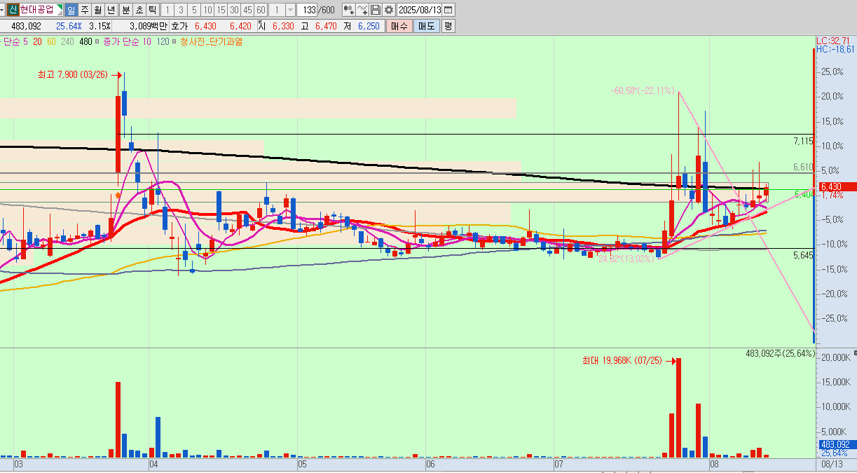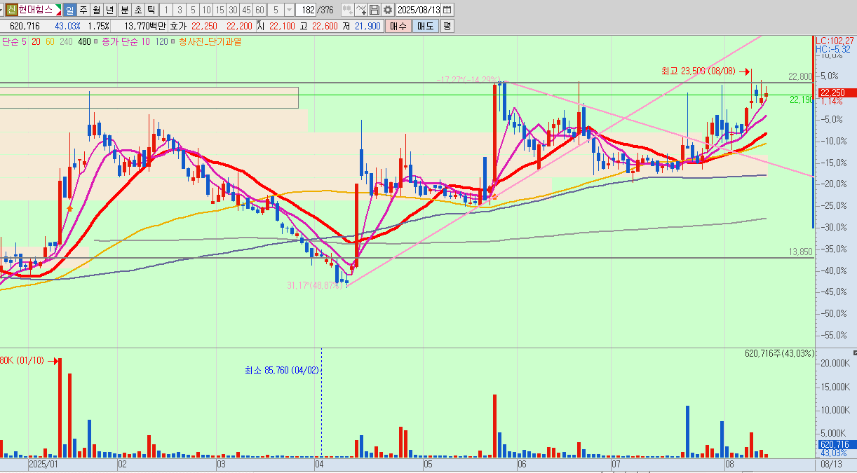 상승 -> 조정 -> 반등, 의 N자 형 패턴이 보이는 종목이다. 아직 위쪽에 480이평이 저항으로 작용하고 있지만, 오늘 종가기준 살짝 돌파를 해주었다.