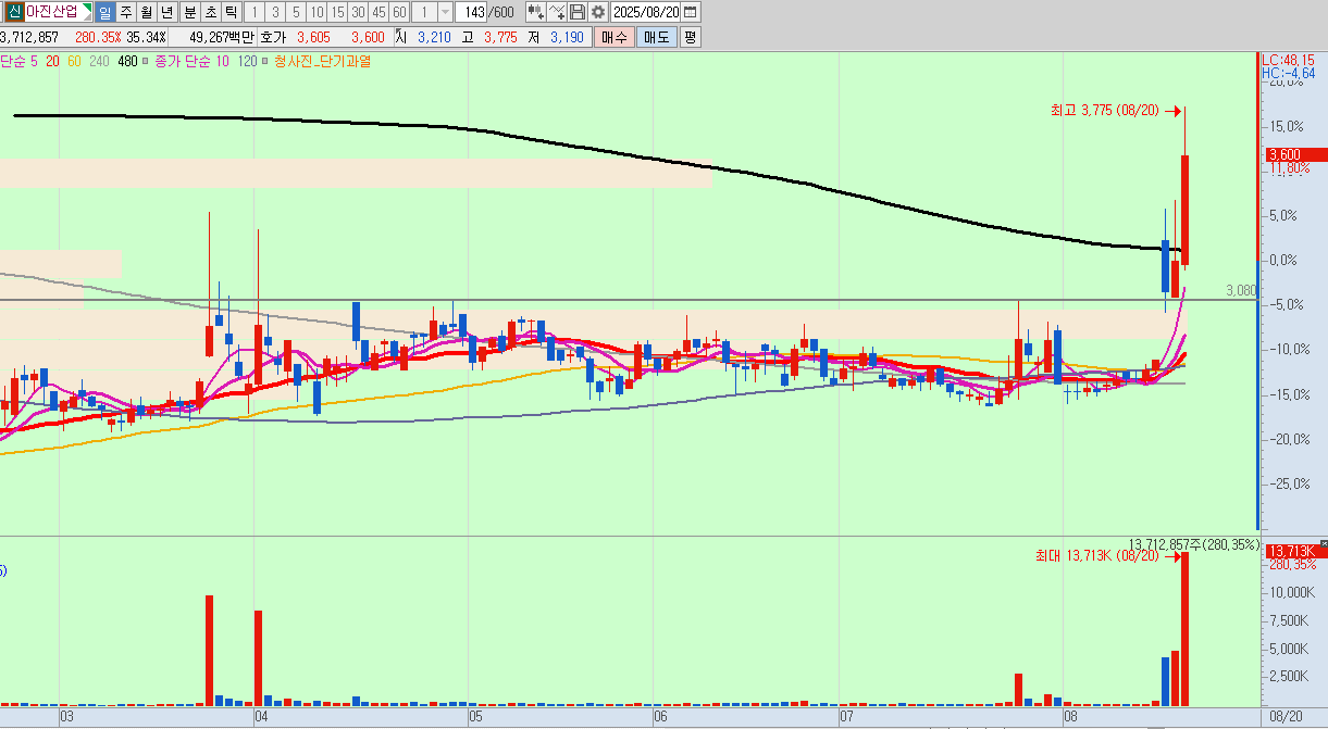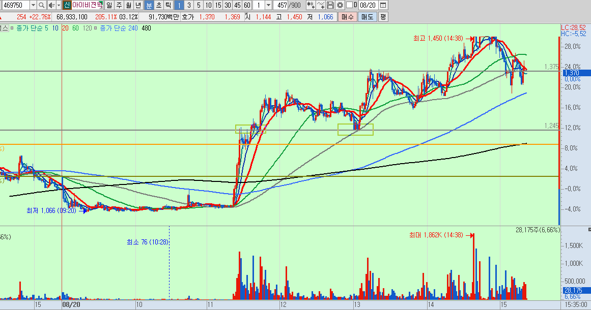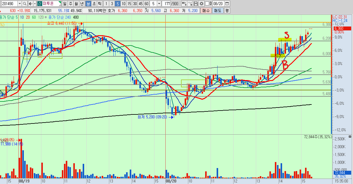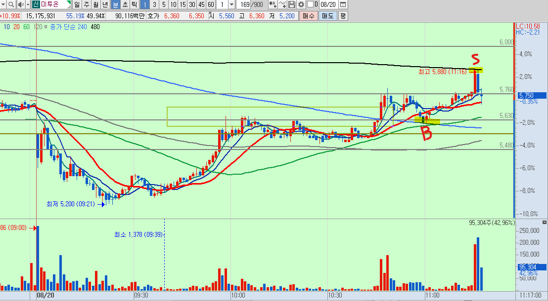 1분봉을 보면, 장 시작 후 눌렸다가 5630원에 저항을 맞으면서 돌파를 못하는 모습을 보여줬다. 그 후 돌파를 했고, 5630에 매수를 걸어두고 다행히 반등이 낭면서 다시 저항으로 작용하던 5760원에 분할 매도 하고, 최종적으로 480분 이평에 전량 매도 하였다.