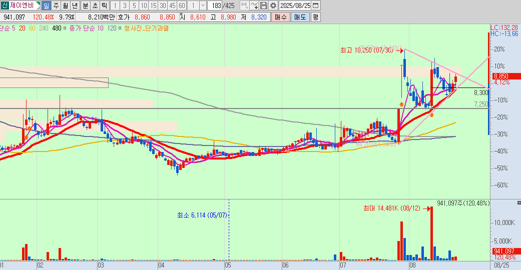 이재명 대통령과 동행한 삼성, SK, LG, 현대 회장님들 입에서 나올 투자관련 내용이지 않을까 싶었다. 그래서 종목을 찾던 중 삼성 반도체 장비주인 제이엔비가 눈에 들어왔다. 7월 28일 상한가 이 후 계속 추적하던 종목인데, 20이평을 깨지 않고 오늘 아래꼬리 달린 양동 도지캔들이 나오면서 상승으로의 전환을 알리는 캔들이지 않을까 싶었다. 그래서 종가 근처에서 매수해보았다. 과연 내일 아침에 어떤 뉴스들이 나와있을지 기대가 된다. 그리고 장 후반에 아래와 같은 뉴스가 나와주면서 나의 생각이 틀리지 않았구나 생각했다.