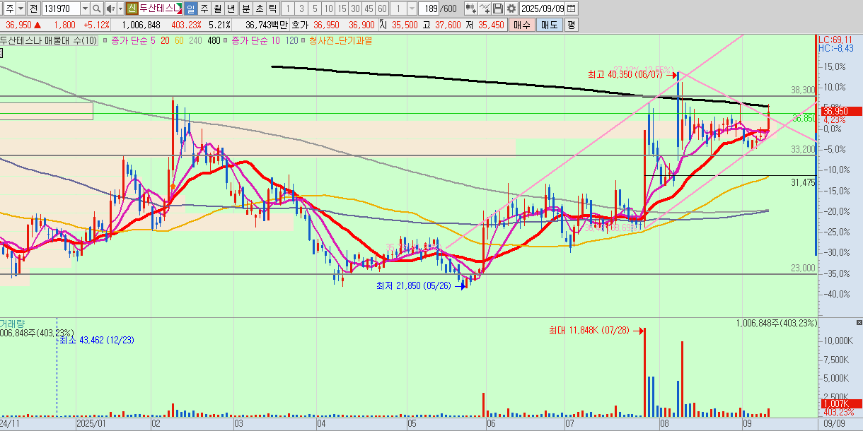 로봇관련주이다. 8월말에 하락하던 주가가 최저점을 찍고 거래량이 들어오면서 기준봉이 만들어졌다. 이 기준봉은 상한가였다. 그러면서 위아래로 조정, 시간 조정을 거치면서 이평을 정배열로 돌리려고 노력하는 모습이다. 오늘은 10일이평까지 480이평을 제외하고 골든크로스가 나온 상황이었다. 오늘도 10% 가 넘는 상승이 나왔다. 이 상승은 위쪽에 있는 매물대 확인 및 매물대 소화의 꼬리이지 않을까 싶다.