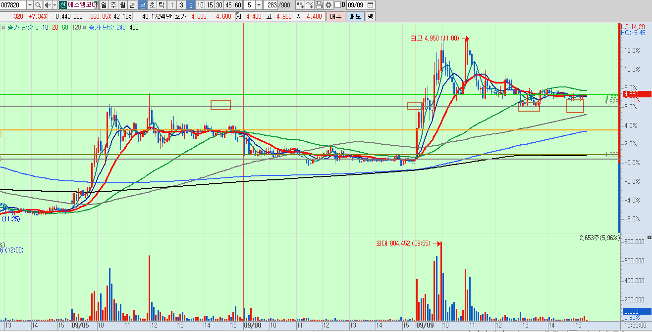 5분봉을 보면 상승 후 고점에서 머물지 않고 바로 내려온 모습을 볼 수 있다. 그것도 두번이나. 매물을 소화하고, 단타하는 개미들을 털어내려고 한것이 아닌가 싶다. 그러면서 기준봉이었던 상한가 고점을 지켜주는 모습이었다. 사실 상한가 고각인 4,635원에서 매수를 하고 싶었지만 자리를 주지 않았다. 그래서 종가에 일부 매수해보았다.