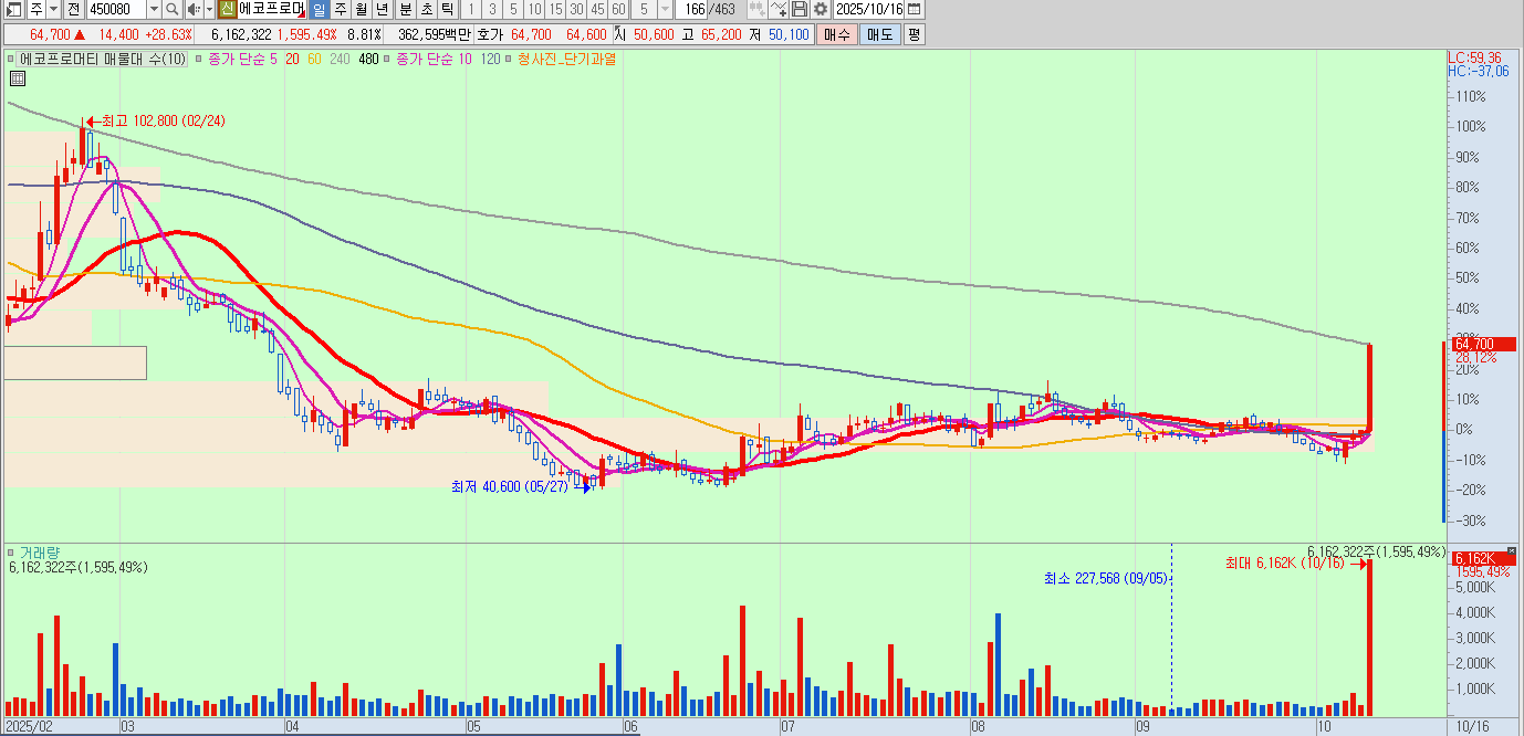 2차전지 관련주이다. 최고가 244,000원까지 기록했던 종목이 오늘 종가 64,700원으로 마감하였다. 그 동안 쭉 하락하던 종목은 올 5월부터 바닥을 잡기 시작하더니 횡보를 해오고 있었다. 그러다 오늘 거래량이 터지면서 상한가 가까운 상승을 보여주었다. 에코프로 형제들이 오늘 다 같이 상승하면서 거래대금이 많이 들어왔기 때문에 당분간은 꾸준히 지켜봐야 될 것으로 보인다.