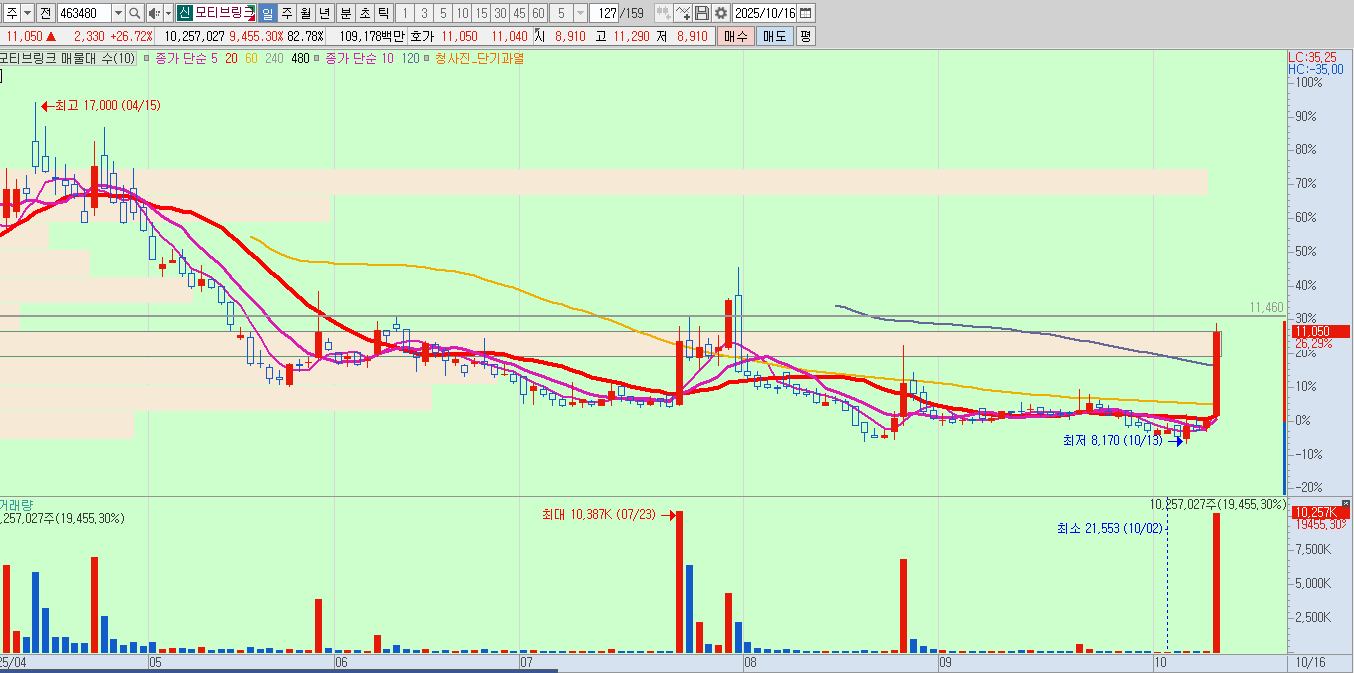 자동차 관련주이다. 신규상장주로 최근 최저점을 찍고, 오늘 26%가 넘는 상승을 보여주었다. 바닥권에서 거래량이 붙고 기준봉이 만들어진 종목은 관심있게 지켜봐야된다. 그리고 추가적으로 관세협상 마무리 관련 뉴스가 나올 수 있기때문에 해당 뉴스에 잘 움직였던 종목은 기억해둘 필요가 있어보인다.