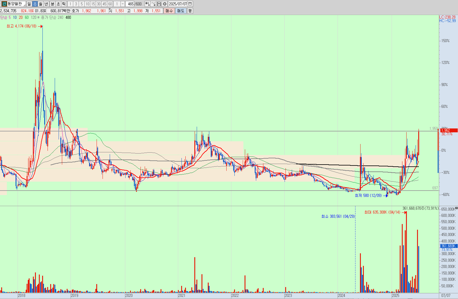 그리고 5월 이후 480이평을 중심으로 등락을 반복하다가 어제 저항으로 작용하던 6500원 근처를 뚫어주었다. 오늘 도 6500원을 지켜주었고, 저항인던 6500원 라인은 지지라인으로 잡고 매수해볼만 해보인다. 그리고 윗꼬리들이 위쪽 매물대를 확인&허물었기때문에 뉴스가 나온다면 충분히 상승이 나올 자리로 보인다.